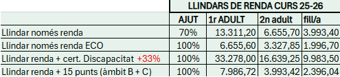 - Llindar de rendiments patrimonials. No superar 1.700,00 € (suma de tots els membres de la unitat familiar)