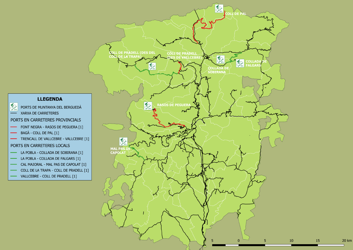 De moment, s’instal·len senyals a 7 ports de muntanya del Berguedà. Tres d’aquests ports són en carreteres provincials: Rasos de Peguera (BV‑4243), Coll de Pal (BV‑4024) i Coll de Pradell (B‑401). Els altres quatre són en carreteres locals: Coll de Pradell (des del Coll de la Trapa), Mal Pas de Capolat, Collada de Falgars (des de la Pobla de Lillet) i Collada de Sobirana (des de la Pobla de Lillet).