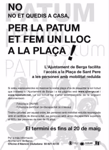 Com ja s’ha anat fent els darrers anys, enguany La Patum també disposarà de l’empostissat de la plaça Sant Pere habilitat per a les persones amb mobilitat reduïda. D’acord amb els criteris establerts la resta d’anys, l’ordre de preferència per poder disposar d’una plaça en aquest espai serà la següent: les persones amb mobilitat reduïda reconeguda amb el certificat de discapacitat corresponent, les persones amb certificat de discapacitat superiors al 65% i, per últim, les persones més grans de 75 anys.