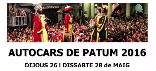 Més de 600 passatgers utilitzaran dijous i dissabte de Patum, els autocars que organitza l'Oficina Jove del Berguedà. Ahir dilluns 23 de maig, va quedar definitivament tancada la venda de tiquets que es feia a cada ajuntament. En total, seran 14 autocars, 7 dijous i 7 dissabte. Els autocars sortiran pels volts de les 8 del vespre (depèn del municipi) i tornaran des de Berga fins a l'origen a les 5 de la matinada, des de la Plaça Gernika.