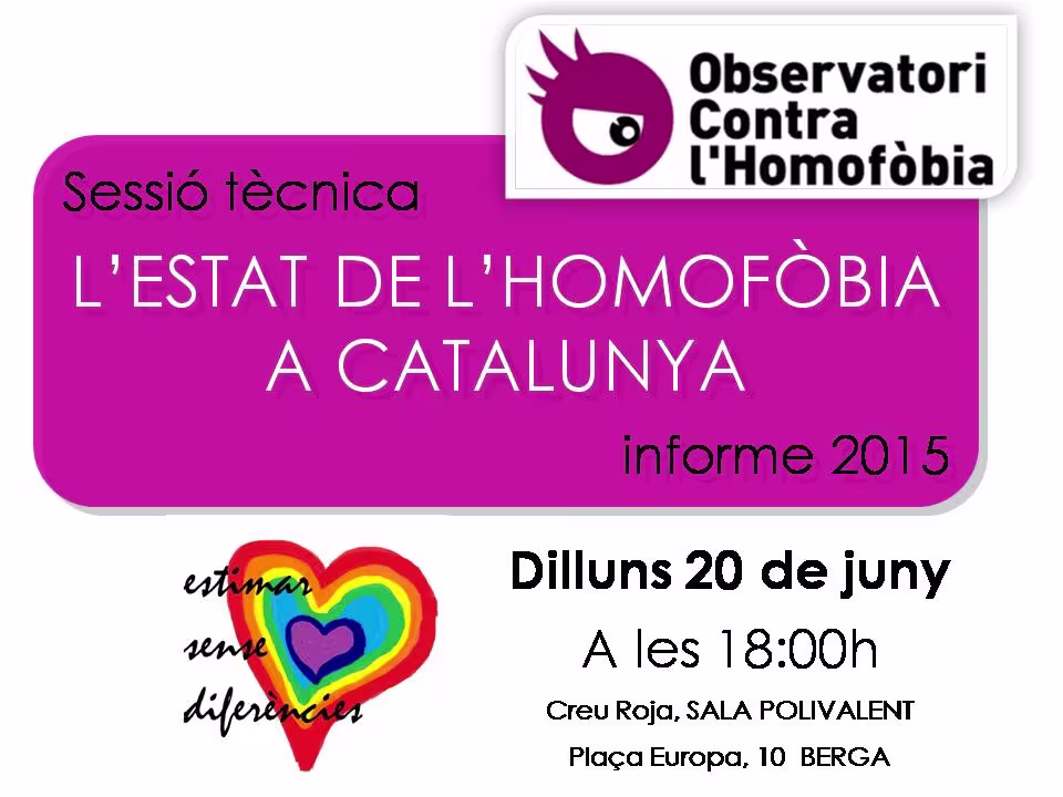Paral·lelament, a nivell tècnic i de professionals per a tots els serveis i agents de la comarca, s’organitza una jornada de presentació de l’Informe 2015 per part de l’Observatori Contra la Homofòbia de Catalunya: 20 de juny a les 18:00h (Plaça Europa, 10 de Berga, Creu Roja) amb inscripció prèvia http://goo.gl/forms/Ejpl8nBTbwyWMo7E2