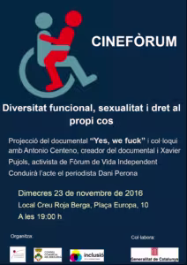 En paral·lel el dimecres 23 de novembre hi haurà un cinefòrum sobre diversitat funcional, sexualitat i dret al propi cos. L’acte tindrà dues parts un visionat del documental “Yes, we fuck”, que és un documental que parla de la figura de l’assistent sexual i la necessitat i l’oportunitat que genera amb les persones amb diversitat funcional. “El documental ens mostra 6 històries entorn al sexe i la diversitat funcional, històries reals i diverses on el sexe es converteix en una arma de plaer en pro dels drets individuals i col·lectius de les persones.” Comptaríem amb la participació de l’Antonio Centeno, que és un dels dos creadors del documental i l’activista de Fòrum de Vida Independent, Xavi Pujols. L’acte es farà al local de la Creu Roja a Berga a les 7 de la tarda i estarà conduit pel periodista berguedà Dani Perona.